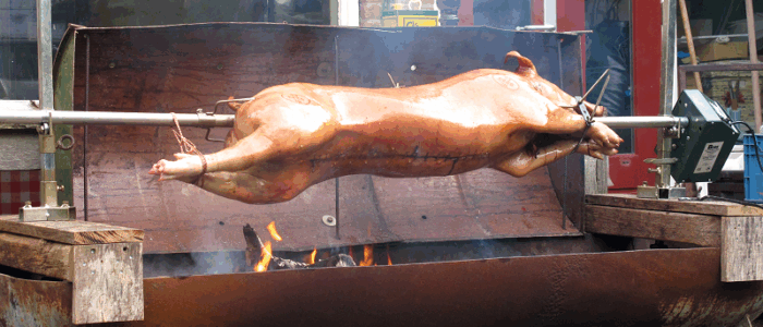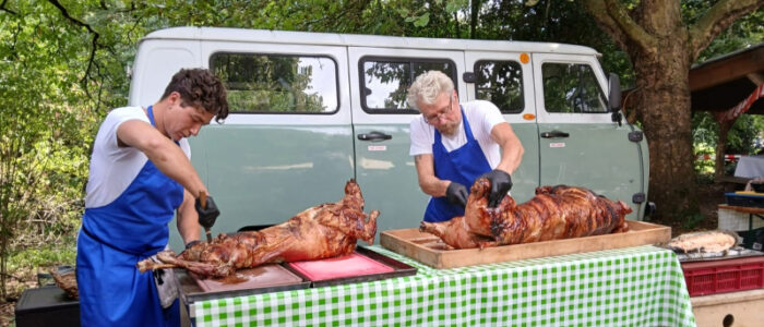 Heerlijk! Een lam of varken aan het spit. Niet eerst gestoomd in de oven en later opgewarmd aan het spit, maar ter plekke urenlang gegaard boven de hete kolen. Van buiten knapperig en van binnen heerlijk zacht en sappig. Wij gebruiken alleen dieren die tijdens hun leven veel bewegingsvrijheid en buitenlucht hebben gekregen, kortom: een goed leven hebben gehad. Niet alleen is dit voor de dieren heel prettig, het zorgt ook voor vlees van hoge kwaliteit met veel smaak.